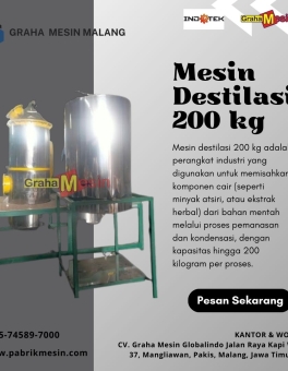 *Harga Hubungi CSMesin Destilasi 200 KG Mesin destilasi 200 kg adalah perangkat industri yang digunakan untuk memisahkan komponen cair (seperti minyak atsiri, alkohol, atau ekstrak herbal) dari bahan mentah melalui proses pemanasan dan kondensasi, dengan kapasitas hingga 200 kilogram per proses. Video Mesin Fungsi: Meningkatkan efisiensi produksi ekstraksi cairan alami Menghasilkan minyak atsiri, essential oil, atau distilat… selengkapnya