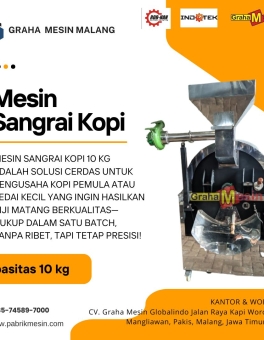 *Harga Hubungi CSMesin Sangrai Kopi 10 kg Mesin sangrai kopi dari Graha Mesin Malang berfungsi untuk menyangrai biji kopi mentah secara merata dan terkontrol, menghasilkan biji matang berkualitas tinggi yang siap digiling atau dikemas—ideal untuk kebutuhan usaha kopi skala rumahan hingga komersial. Spesifikasi Teknis Kapasitas: 10 kg / batch Sumber Pemanas: LPG (dapat dikustomisasi) Bahan Konstruksi: Stainless… selengkapnya