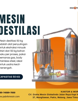 Mesin Destilasi 50 kg Mesin destilasi 50 kg adalah alat penyulingan mini untuk menghasilkan minyak atsiri dari bahan alami (daun, bunga, rempah) dengan kapasitas 50 kg per proses — cocok buat usaha rumahan hingga skala UMKM. Video Mesin Spesifikasi Utama Kapasitas: 50 kg/batch Bahan: Stainless steel food grade (SUS 304) Pemanas: Gas LPG (tabung 3… selengkapnya