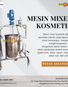 Mesin Mixer Kosmetik Mesin mixer kosmetik ini adalah solusi produksi andal untuk pelaku usaha skincare, body care, dan kecantikan lokal. Dengan desain stainless steel full body, motor listrik berdaya tinggi, dan sistem pengaduk ganda, mesin ini mampu menghasilkan krim, lotion, serum, sabun cair, dan masker dengan tekstur halus, stabil, dan siap kemas — dalam waktu… selengkapnya