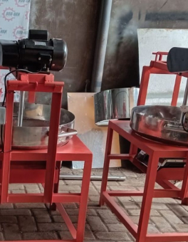 Pastikan mesin dalam kondisi bersih dan siap digunakan. Siapkan bahan cair seperti VCO, madu, atau sari buah yang akan diproses, lalu tuangkan ke dalam tabung double jacket. Sistem ini berfungsi menjaga panas agar tidak langsung mengenai bahan. -