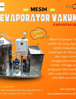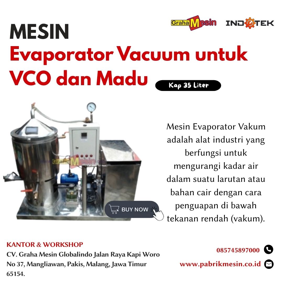Graha Mesin menghadirkan Evaporator Vacuum untuk VCO dan Madu, sebuah inovasi mesin penguapan cairan yang dirancang dengan teknologi modern dan presisi tinggi. Mesin ini digunakan untuk mengurangi kadar air pada bahan cair seperti minyak kelapa murni (VCO), madu, sari buah, dan bahan cair lainnya tanpa merusak kandungan nutrisi serta kualitas alami produk.