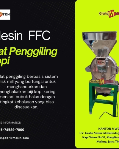 Graha Mesin menghadirkan mesin FFC penggiling kopi, yaitu mesin giling tipe disk mill yang dirancang untuk menghaluskan biji kopi sangrai menjadi bubuk dengan tingkat kehalusan yang dapat diatur. Mesin ini banyak digunakan oleh pelaku usaha kopi kemasan, UMKM, maupun industri rumahan karena mampu bekerja cepat, stabil, dan menghasilkan bubuk yang konsisten halus.