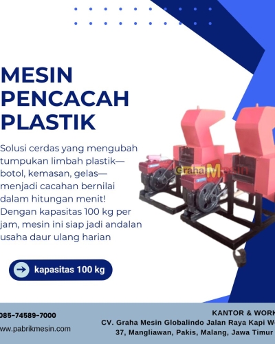 *Harga Hubungi CSMesin Pemotong dan Penghancur Plastik Graha Mesin menghadirkan Mesin Pemotong dan Penghancur Plastik, yaitu alat industri yang berfungsi untuk memotong, mencacah, serta menghancurkan limbah plastik menjadi potongan kecil (flakes) berukuran sekitar ±10 mm. Mesin ini sangat dibutuhkan oleh pelaku usaha daur ulang plastik, pengrajin bahan plastik, maupun industri pengolahan limbah untuk mempermudah proses pencucian dan… selengkapnya