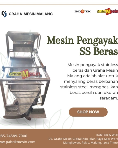Mesin pengayak stainless beras dari Graha Mesin Malang adalah alat industri yang dirancang untuk menyaring dan memisahkan butiran beras berdasarkan ukuran, menggunakan saringan berbahan stainless steel yang tahan karat dan higienis. Mesin ini biasanya digunakan dalam proses pengolahan padi menjadi beras siap konsumsi untuk menghasilkan beras yang lebih bersih dan seragam ukurannya.