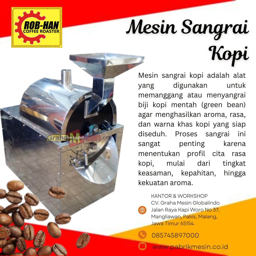 Mesin sangrai kopi adalah alat yang digunakan untuk memanggang atau menyangrai biji kopi mentah (green bean) agar menghasilkan aroma, rasa, dan warna khas kopi yang siap diseduh. Proses sangrai ini sangat penting karena menentukan profil cita rasa kopi, mulai dari tingkat keasaman, kepahitan, hingga kekuatan aroma. Anda bisa membeli mesin ini di Graha Mesin
