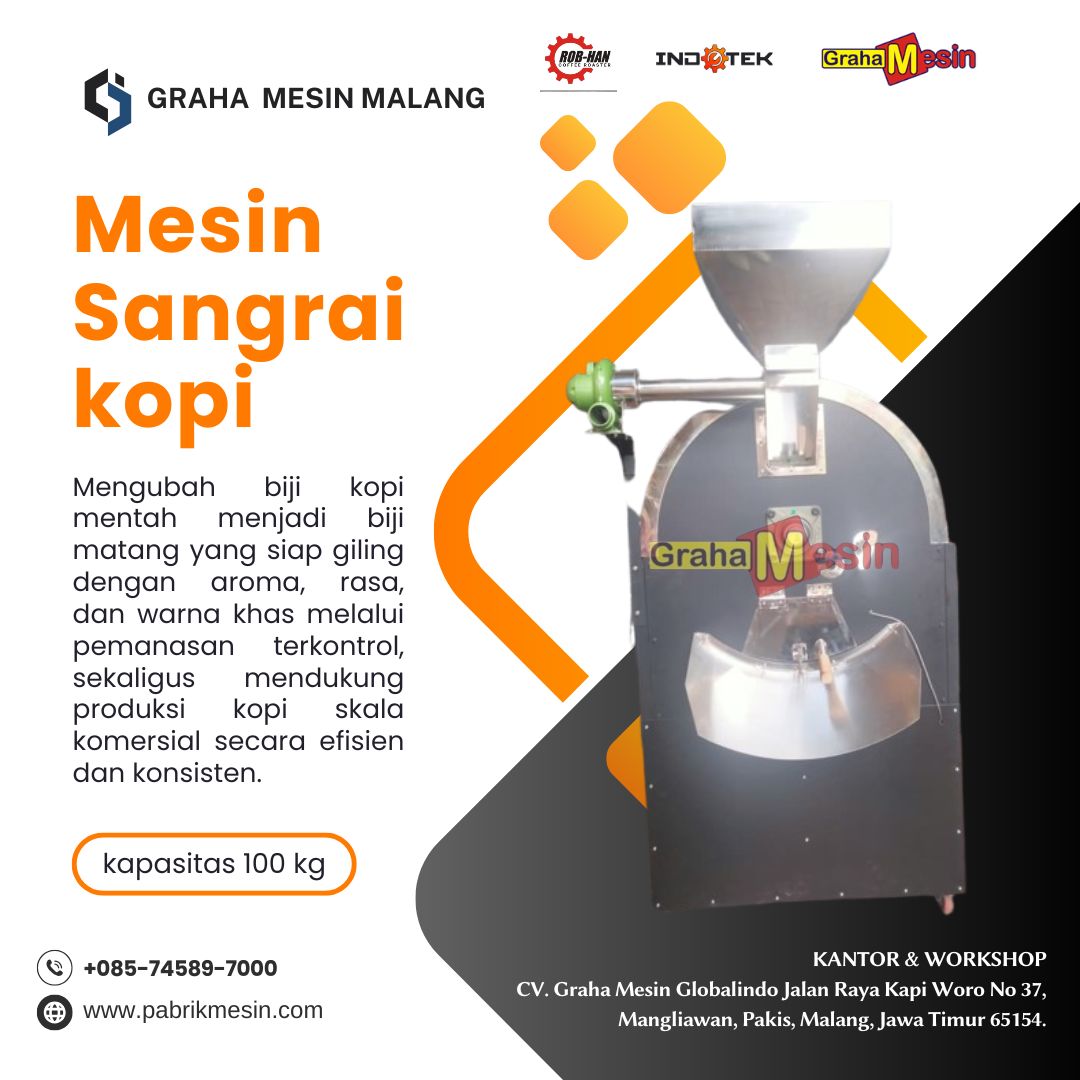 *Harga Hubungi CSMesin Penggiling Kopi Mesin penggiling kopi (coffee grinder) adalah peralatan khusus yang dirancang untuk menghancurkan biji kopi utuh menjadi bubuk dengan ukuran partikel yang seragam. Proses penggilingan ini sangat penting karena memengaruhi ekstraksi rasa dan aroma kopi saat diseduh. Spesifikasi Mesin Model: MKS-G100 Kapasitas: 50-70 kg/jam Material: Stainless Steel 304 Daya: 2 HP (1.5 kW)… selengkapnya