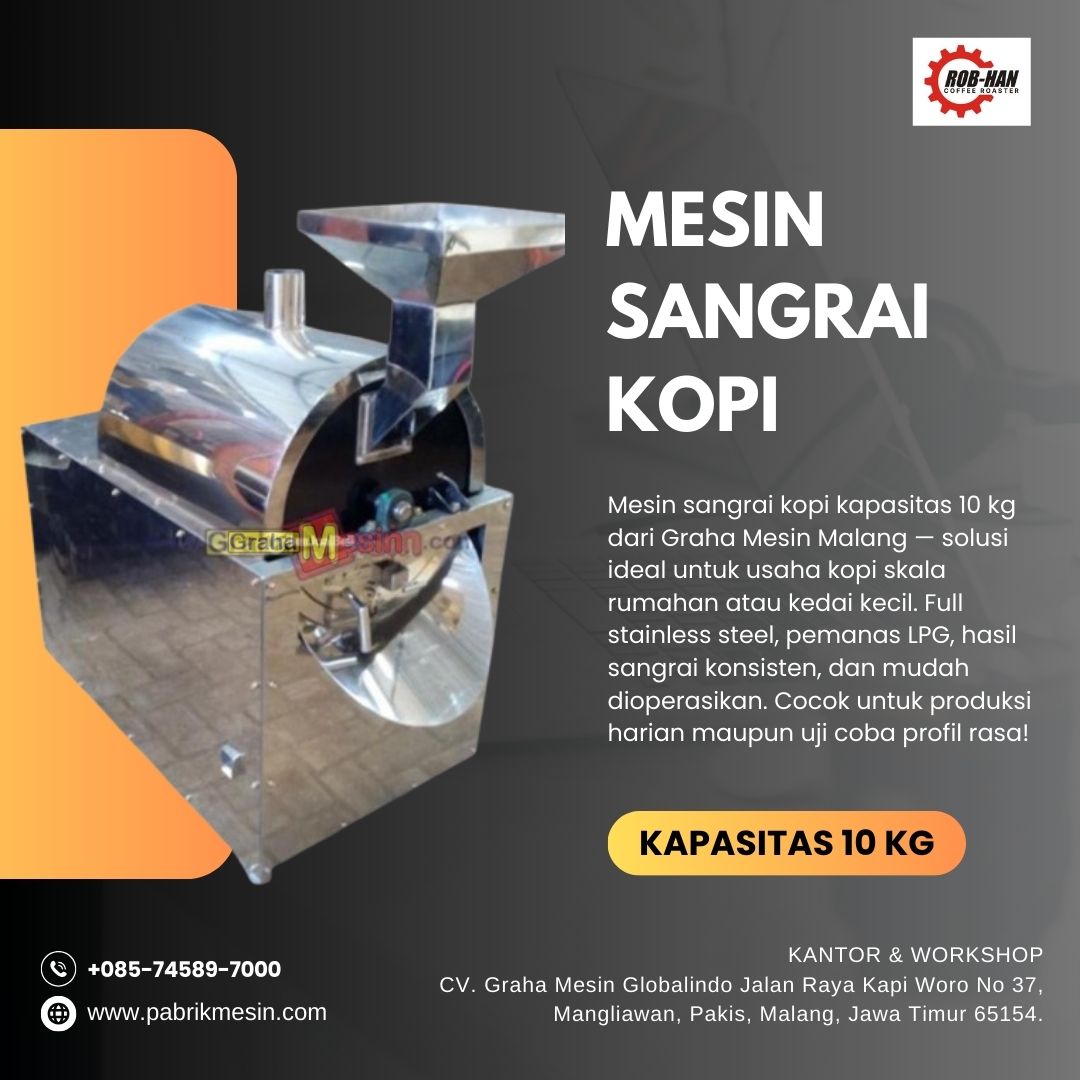 *Harga Hubungi CSMesin Roasting Kopi Gold Mesin Roasting Kopi Gold kapasitas 15 kg dari Graha Mesin Malang adalah alat pemanggang biji kopi komersial yang dirancang untuk menghasilkan kopi berkualitas tinggi secara konsisten, dengan kapasitas produksi hingga 15 kilogram per proses. Video Mesin Spesifikasi: Kapasitas: 15 kg per proses Dimensi: Disesuaikan dengan desain standar industri (±120 x 80… selengkapnya